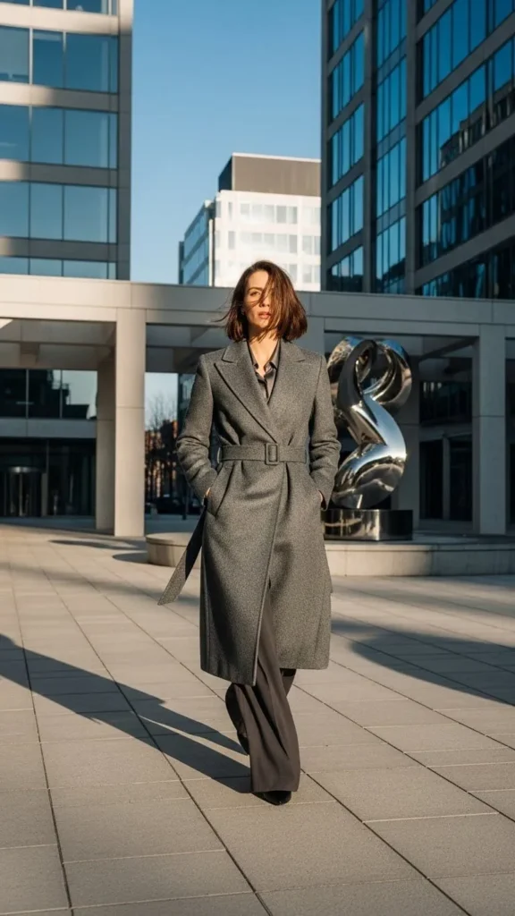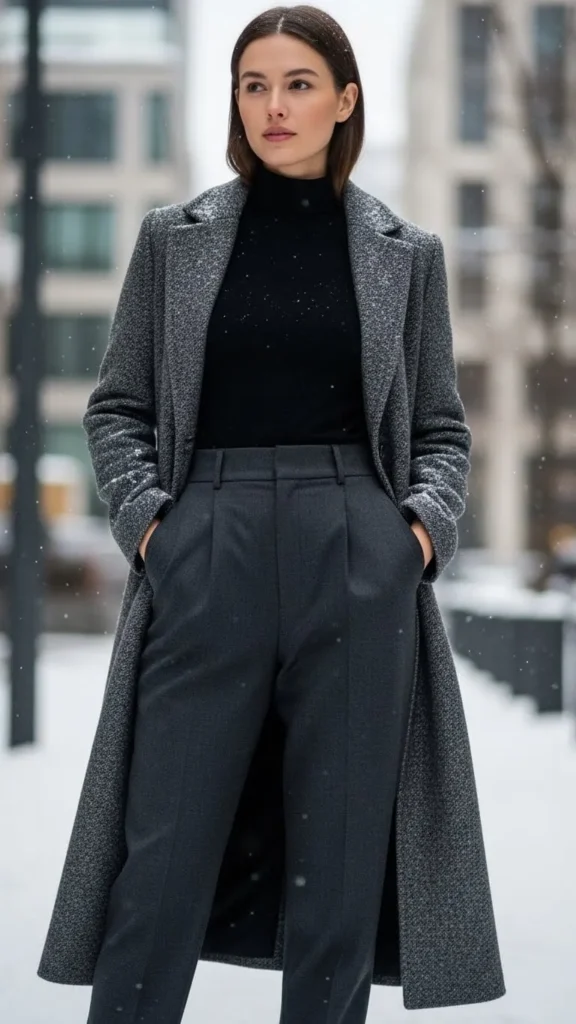 A tailored coat pairs effortlessly with wide-leg pants. It creates long lines that feel polished and practical. Choose pants with a slight drape so they fall cleanly over boots. If you’re saving money, have older trousers hemmed or pressed—they often look new again with small care updates. Pick a coat with structured shoulders to balance the wide leg. Add a slim knit underneath to keep the silhouette controlled. This look works well for commutes or days when you want comfort without losing shape.