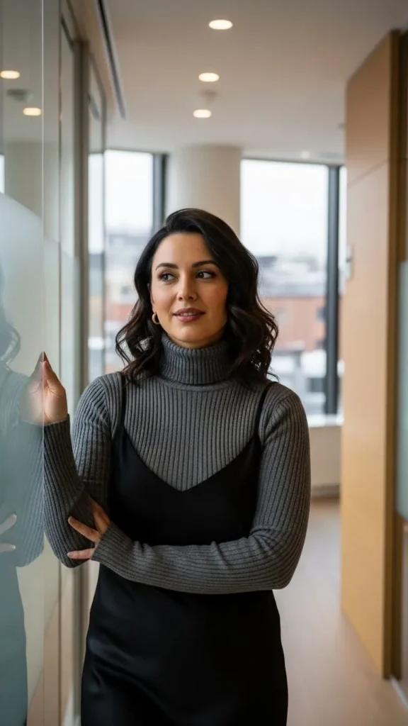 Layering a turtleneck under a slip dress extends the dress into winter while staying office-friendly. Choose a fitted top so the lines stay tidy. Stick to neutral colours so the outfit feels polished. If you’re budget-conscious, this is a great way to repurpose warm-weather dresses instead of buying new pieces. Add tights and boots for warmth. A long coat brings everything together. This look works well for creative offices or days when you want to mix textures.