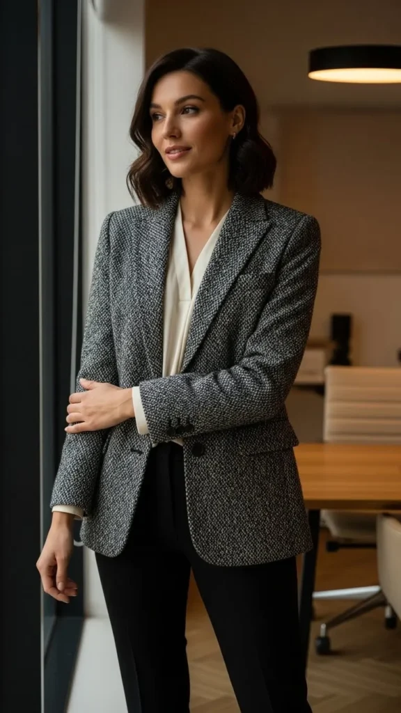 A tweed blazer brings texture to winter outfits. It feels warm and pairs well with slim trousers or dark denim depending on your office rules. Choose muted tones like grey, navy, or brown for a timeless look. If you’re working with a tight budget, search second-hand shops—tweed often ages well and looks polished even after years. Pair with a simple tee or thin knit underneath. Add loafers or ankle boots for structure. This outfit works well for meetings or days when you want extra texture without loud patterns.
