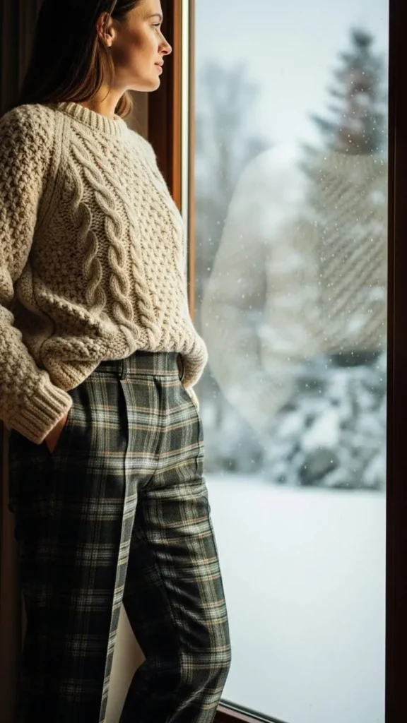 A cable-knit sweater adds texture and warmth. Pair it with plaid trousers to bring pattern into your winter work wardrobe. Keep the colour palette neutral so the look stays professional. If you’re watching your budget, pick trousers in subtle checks—they mix easily with basics you already own. Add simple black boots or loafers. Keep accessories small so the textures take the lead. This outfit works well for creative offices or casual winter Fridays.